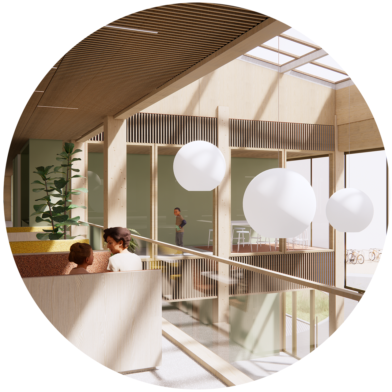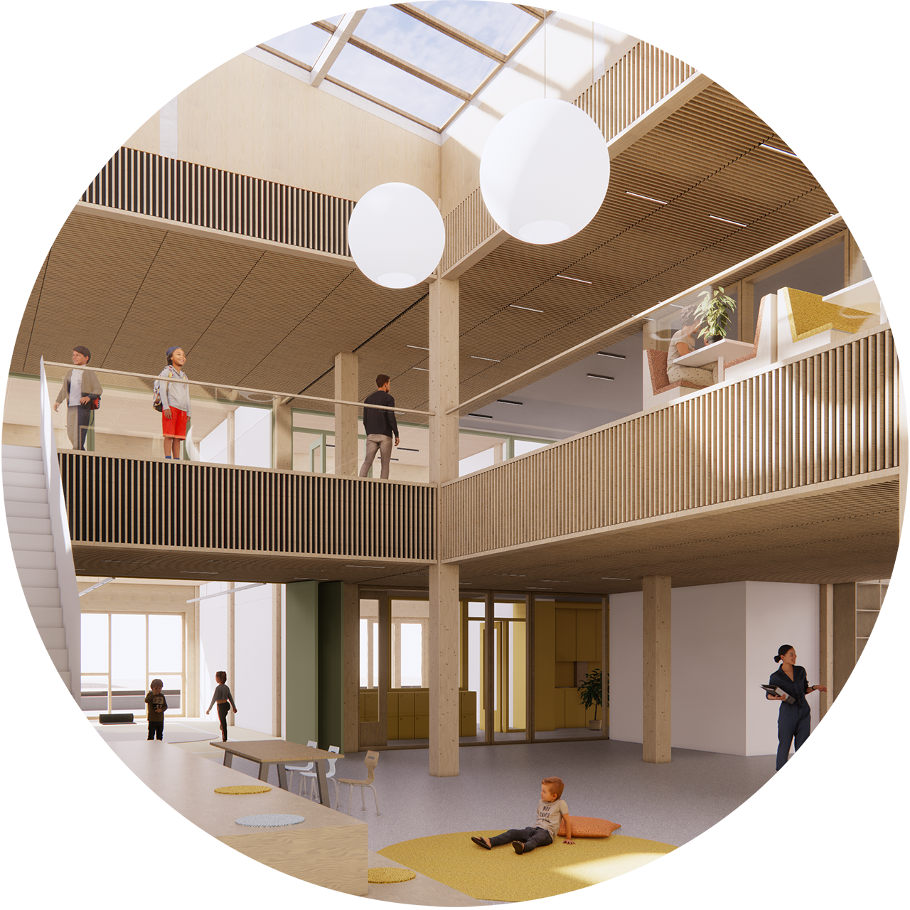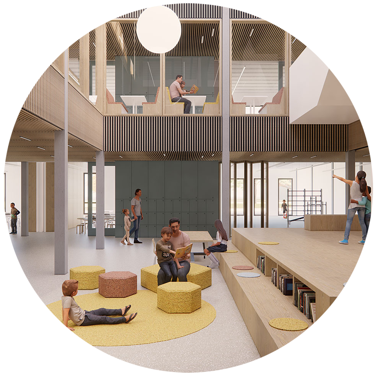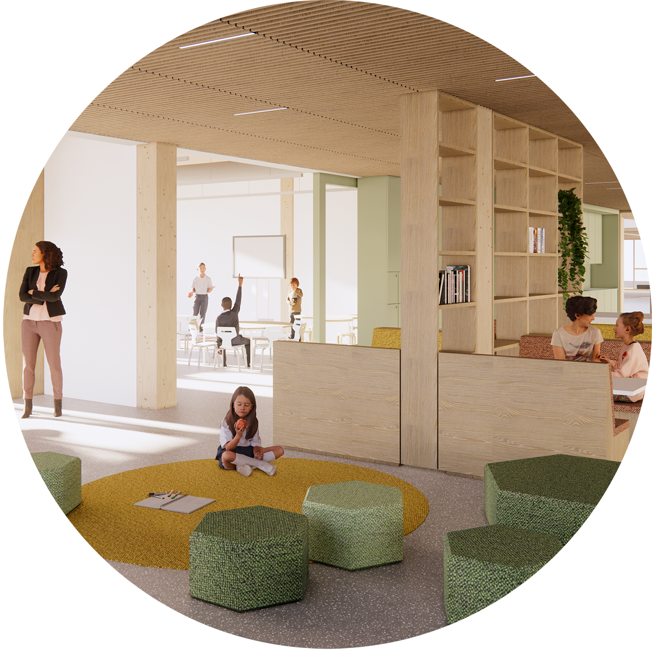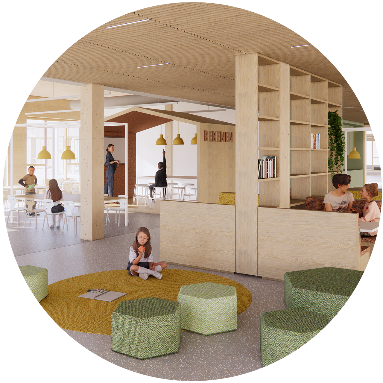 Het casco van de elementaire school bestaat uit kolommen en vloerplaten. Zowel in de betonnen als de houten variant worden geen balken gebruikt waardoor, met een standaard vrije hoogte van 3,5 meter, lichte en rustig ogende ruimten ontstaan. De afwerking van het interieur wordt afgestemd op de wensen van de school. Het casco vormt de basis die we kunnen aanvullen met een houten interieur of een kleurrijk interieur; in overleg met het team van de school maken we die keuzen.